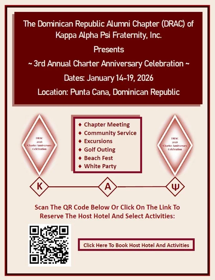 On behalf of the Dominican Republic Alumni Chapter (DRAC), I bid you “saludos” (greetings). As we enter our 3rd year as a Chapter of Kappa Alpha Psi, Inc. with two years previously as an association, we remain enthusiastic in our ability to positively impact underserved communities within the Dominican Republic. As an international Chapter, we face unique challenges in serving a country that is generally not familiar with fraternities along with a different native language and culture. Accordingly, each year our diverse professional membership must continue to enhance our knowledge and capabilities in meeting the needs of our targeted communities across the Dominican Republic.